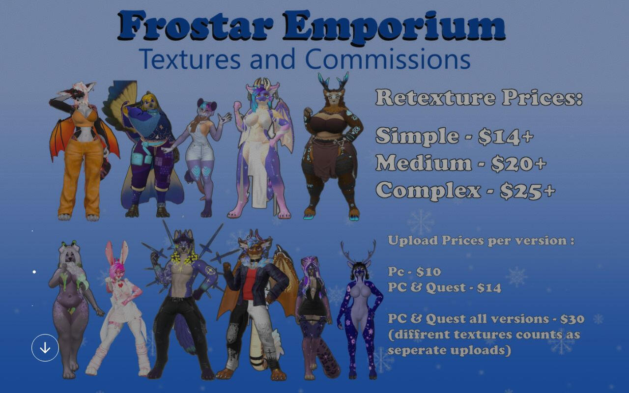 [Fur brushes available: Eslar, twisted sorrow arts, Kufi ]Base Model Outfit recolor -$5 base price (1 top end 1 pants, +$2 for each additional piece, full Model Outfit recolor for 1 version $15)Commercial ( coming with the SPP, Photoshop files for editing ) - + $55 to final priceUploads - $10 PC , $15 PC and QuestAdd on -Foxipaws add-ons - +$2 per add on